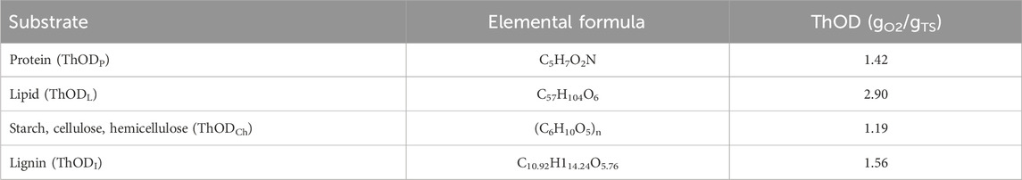 As ADM1 quantifies the system with respect to the chemical oxygen demand (COD), the theoretical oxygen demand (ThOD) is used to quantify the degradability of proteins, lipids, starch, cellulose, hemicellulose, and lignin. As lignin has no defined structure, Nadji et al. (2009) determined the formula from Stipa Tenacissima (L.). Lignin is entirely inert within this model, while lipids, proteins, and starches are entirely biodegradable. Cellulose and hemicellulose are partially degradable. Table 2 displays the ThOD for each fraction within the model (Koch et al., 2010).