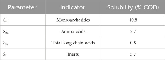 Additional characterization is required for manure, as the substrate has already been partially disintegrated from the cow’s rumen (Zhou et al., 2011). Soluble components for monosaccharides (Ssu), amino acids (Saa), long-chain fatty acids (Sfa), and inerts (Si) are calculated based on the Xc, then subtracted from the individual components as Zhou et al. (2011) proposed. Ssu was subtracted from Xch, Saa was subtracted from Xpr, Sfa was subtracted from Xli, and Si was subtracted from Xi. Table 3 highlights the soluble percentages within manure from Wichern et al. (2007). As acetate’s solubility was determined to be 0.0 by Wichern et al. (2009), it was not considered in calculations.