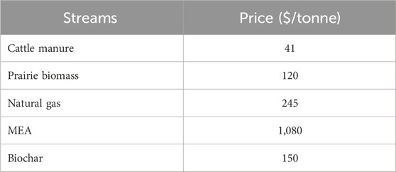 Wild et al. (2024) determined the cost of prairie biomass from the break-even farm gate prices for switchgrass, at $105/tonne. Krohn (2015) reported that farmers selling switchgrass for $120/tonne are profitable and may have the potential to outcompete corn and soy on low-quality land. Additionally, the price of manure is now based on application rates of liquid manure to a crop field, calculated to be $41/tonne (Olsen and Leibold, 2022). While biochar prices in literature range extensively, Thengane et al. (2021) estimated the product to have a minimum selling price of $150/tonne. Finally, Rajendran et al. (2019) utilized an IRR of 7% for a biogas upgrading plant receiving incentives. All streams with associated costs are shown in Table 4.