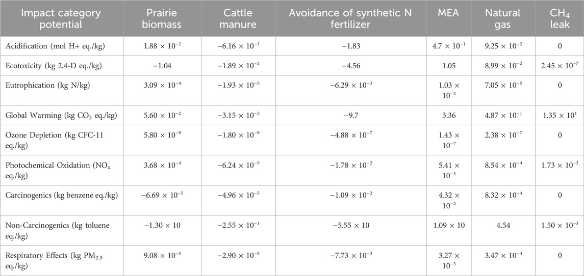 The lifecycle impacts of prairie grass cultivation on land use and fertilizer dynamics is a research area of growing interest (Li et al., 2025). Several groups are collecting the field data to improve the modeling of prairie grass landscapes (Edmonds et al., 2021). These factors could significantly impact the environmental performance of grass AD system. This study relies on factors available in EcoInvent, which may require updates to reflect modern practices. A detailed characterization of the land use and fertilizer displacement impact factors is outside the scope of the present study.
