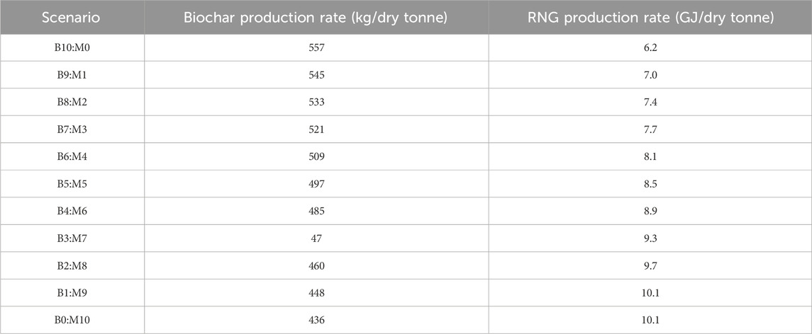 As the model is based on the VS content of the feedstocks, manure is required in a much greater quantity than biomass within our system. As a result, the two mono-digestion scenarios have a flow rate of 6,560 kg/hr and 1,210 kg/hr for manure and biomass, respectively. Digestate production levels increase with the addition of biomass, with the largest production rate of 557 kg/dry tonne (B10:M0) due to the recalcitrant nature of the biomass. B1:M9 has the largest CH4 production from biogas, while B0:M10 has the largest residual CH4 collected from the digestate. The residual CH4 from the digestate increases linearly with the addition of manure, from 57 m3/dry tonne to 139 m3/dry tonne. B1:M9 is the largest producer of RNG at 10.1 GJ/dry tonne. The RNG produced in B1:M9 is 39% larger than the RNG produced in B10:M0. Further results are displayed in Table 6.