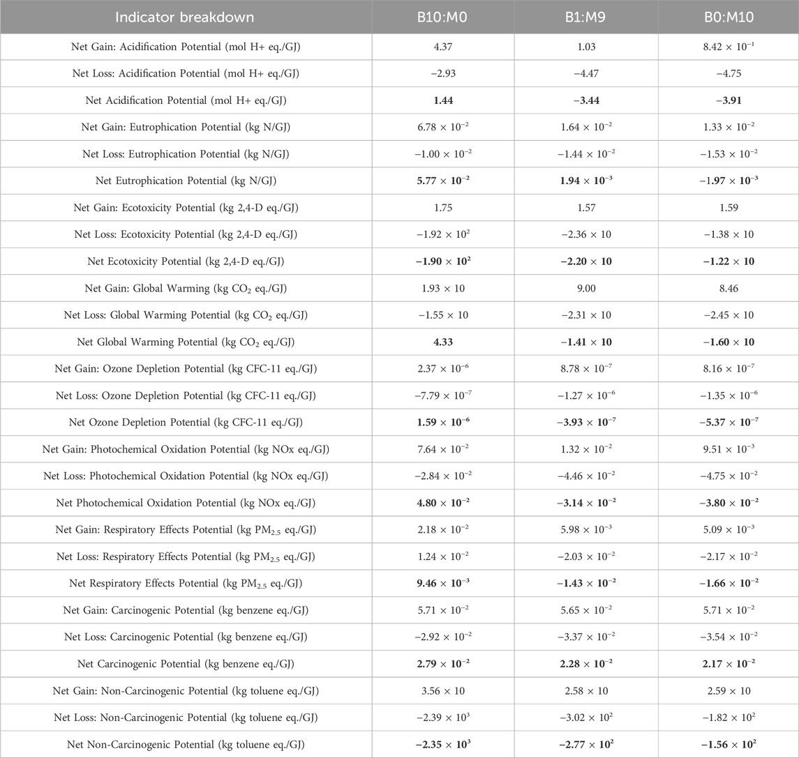 Table 7. Burdens, gains, and net values for each impact category are displayed for B10:M0, B1:M9, and B0:M10.