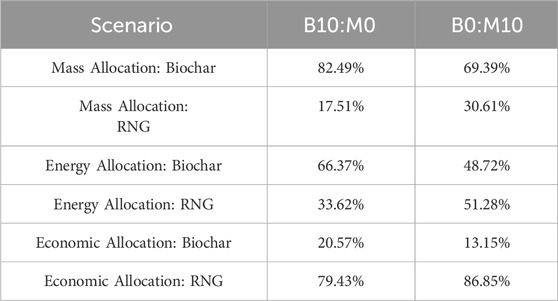 The total global warming potential for B10:M0 was estimated at 19.32 kg CO2 eq./GJ without considering the impacts of biochar. Utilizing the above allocation emissions, RNG is responsible for 3.38 kg CO2 eq./GJ (mass), 6.50 kg CO2 eq./GJ (energy), or 15.35 kg CO2 eq./GJ (economic), depending on the allocation method used. A more detailed discussion on the impact of various allocation methods on biochar and RNG systems is discussed in the study by Wild et al. (2024).