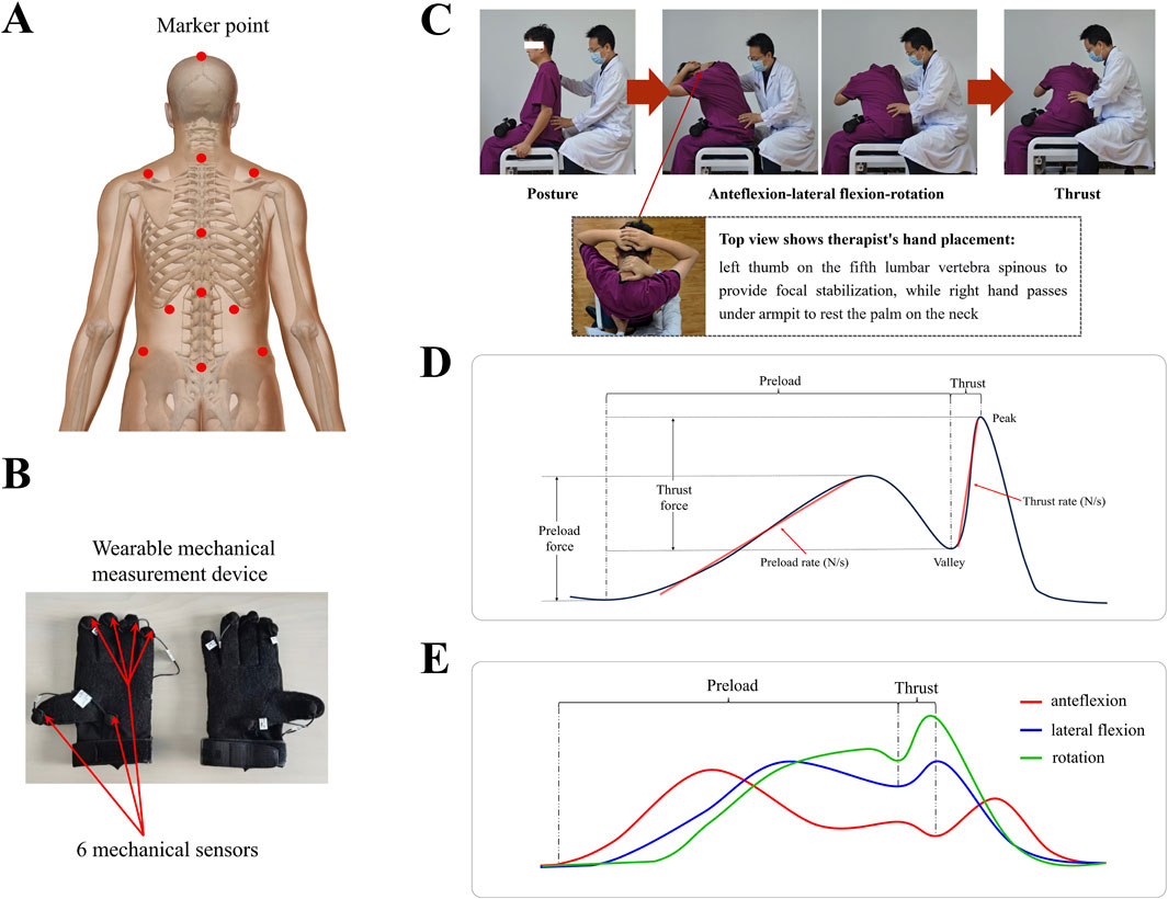 Figure 1. (A) Calibration of marker points for the motion capture system to capture three-dimensional movement directions. (B) Wearable force sensors placed at six points on the thumb, palm, and metacarpophalangeal regions to capture force data with a measurement accuracy of 0.1 N and a frequency range of 0–100 Hz. (C) The procedure of seated lumbar rotation manipulation, using the right side as an example, divided into two core phases: preload and thrust. (D) A schematic representation of typical force changes during the procedure with force measured at hand on the subject’s neck. (E) A schematic representation of typical three-dimensional angle changes during the procedure.