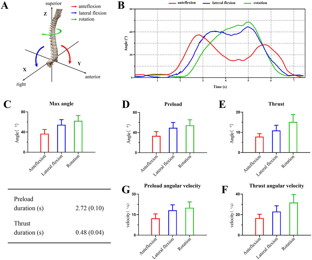 Figure 2. Kinematic description of seated lumbar rotation manipulation. (A) Definition of the three-dimensional coordinate system during the procedure. (B) Changes in three-dimensional directional angles for a single subject during manipulation. (C) The maximum angle changes in three-dimensional direction during the whole manipulation process. (D, E) Comparisons of angle changes in three-dimensional direction during different process. (F, G). Comparisons of angular velocities in three-dimensional direction during different process.