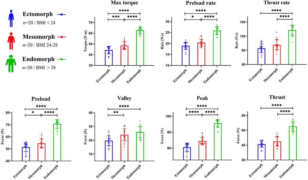 Figure 3. Comparison of force parameters (Max torque, preload rate, thrust rate, preload force, valley force, peak force, thrust force) between groups stratified by BMI. The force data presented are measured at the hand on the subject’s neck. Asterisks indicate statistically significant differences between groups (*P < 0.05; **P < 0.01; ***P < 0.001; ***P < 0.0001).