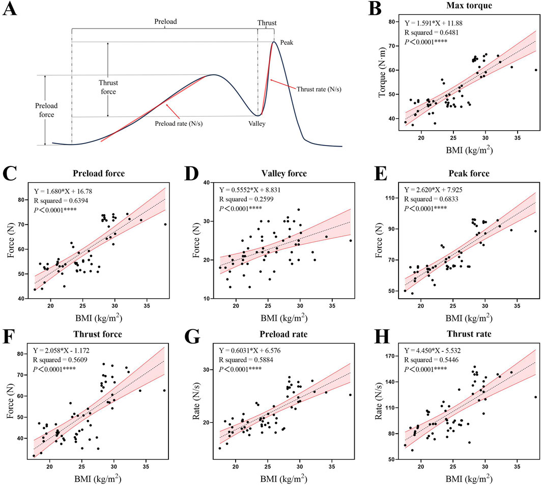 Figure 4. (A) Schematic representation of typical force changes during the procedure, with annotations for the identification of different force parameters. (B–H) Linear regression diagrams depicting the relationships between BMI and various force parameters: max torque, preload force, valley force, peak force, thrust force, preload rate, and thrust rate. The force data presented are measured at the hand on the subject’s neck. The shaded area represents the 95% confidence interval for the regression line.