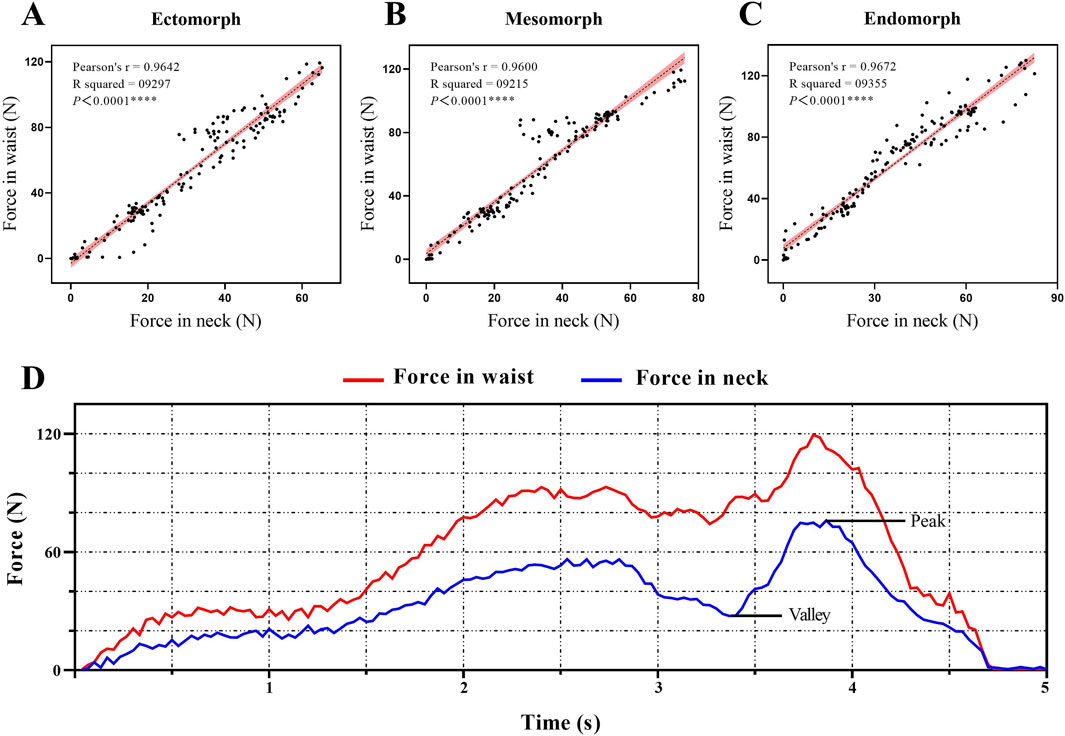 Linear regression analysis demonstrated a positive correlation between BMI and force parameters (P < 0.05). The strongest correlation was between BMI and peak force (R2 = 0.6833, P < 0.0001), while the weakest correlation was between BMI and valley force (R2 = 0.2599, P < 0.0001) (Figure 4). Based on the coordinated hand force characteristic of the technique, Pearson correlation analysis showed a significant positive correlation between the forces exerted by both hands (force in neck and force in waist) during the procedure (r = 0.990, P < 0.001). We also described the force variation curves for both hands during a single manipulation and the typical Pearson correlation of hand forces in different BMI groups (Figure 5). Time-domain analysis revealed high bilateral hand coordination during manipulation procedure, with force in neck peaking at 73.77 ± 13.83 N and force in waist at 119.14 ± 13.83 N, demonstrating a peak force time delay of 66.71 ± 49.02 ms.