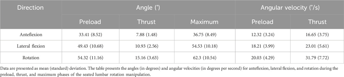 A total of 60 participants successfully completed both the left- and right-side manipulations. No statistically significant differences were found in the comparison of kinematic and mechanical parameters between the left- and right-side manipulations (Supplementary Table S1). For each subject, the measurements from the two sides were averaged to obtain representative values. The force parameters (preload force, valley force, thrust force, peak force, preload rate, thrust rate, and maximum torque) were measured at the hand on the subject’s neck rather than on waist. The following sections present the detailed kinematic and mechanical characteristics of the seated lumbar rotation manipulation.