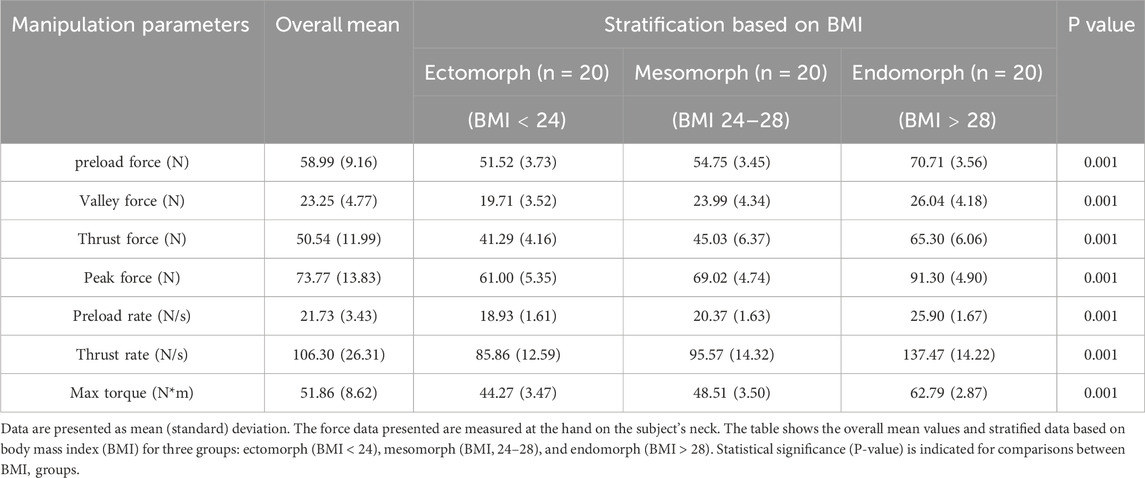 Results: Kinematic analysis indicated that the angles in three directions were greatest for rotation, followed by lateral bending and flexion. Similarly, rotation was the dominant angular velocities, greater than lateral flexion and anteflexion. Furthermore, Preload duration (2.72 ± 0.10 s) and thrust duration (0.48 ± 0.04 s) were recorded. In terms of force, four key force metrics were calculated: preload force (58.99 ± 9.76 N), valley force (23.25 ± 6.24 N), thrust force (50.54 ± 9.63 N), and peak force (73.77 ± 11.06 N). While the preload rate (21.73 ± 4.66 N/s), thrust rate (106.30 ± 11.72 N/s), and the maximum torque (51.86 ± 7.52 N m) were determined. Subgroup analysis showed significant differences in force parameters by body types (P < 0.01). Linear regression revealed a positive correlation between BMI and force parameters (P < 0.05), and Pearson analysis indicated a significant correlation between forces exerted by both hands (P < 0.05).