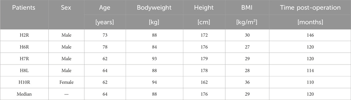 Ten subjects were previously treated with instrumented THA (Damm et al., 2010; Bergmann et al., 2007; Graichen et al., 2007) due to severe OA. Six patients consented to participate in the skiing trials 10 years after implantation, of which five were able to execute at least two of the cross-country skiing movements correctly (Table 1). None of the participants reported any real world or simulated skiing experience. Subjects had no grave comorbidities and movement was ensured to be painless. Except for one patient (H8L), the instrumented joint was on the right side. For comparability, data from H8L were mirrored. The exercises were executed all in 1 day. Measurements took place in the years 2019–2022.