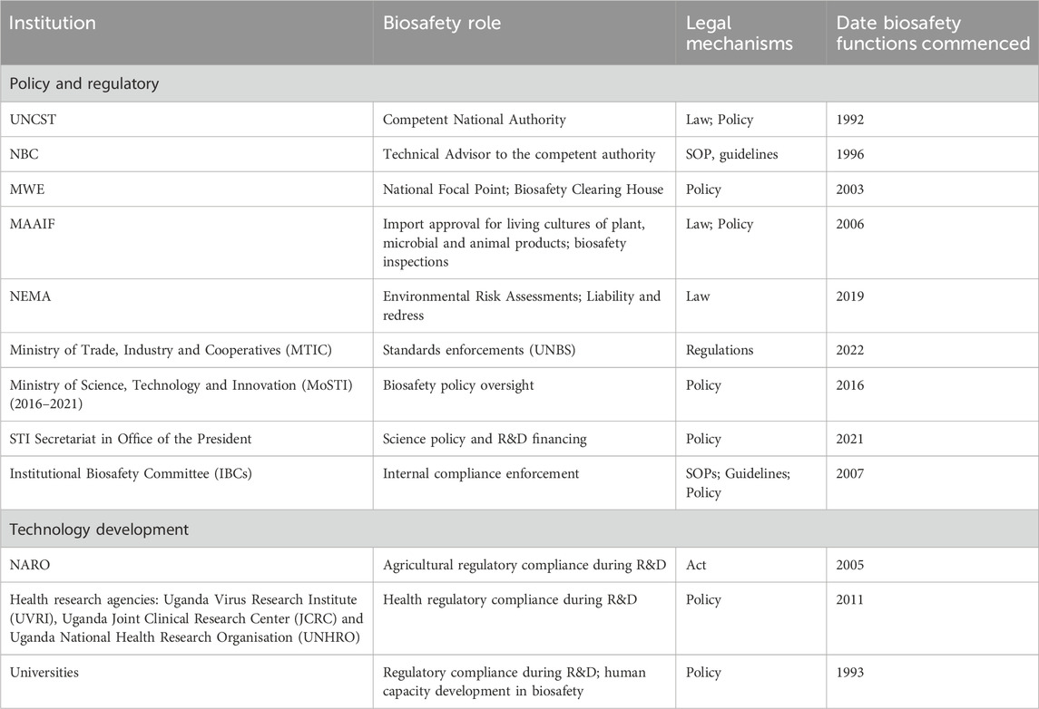 Citation: Zawedde BM, Kwehangana M, Ongu I, Ibanda AW, Wasswa P, Kiggundu A, Mugoya C, Kasule D, Makara AM, Hafashimana D, Ssengooba T and Oloka HK (2025) Uganda’s evolving national biosafety system: lessons from the past 30 years. Front. Bioeng. Biotechnol. 13:1654335. doi: 10.3389/fbioe.2025.1654335