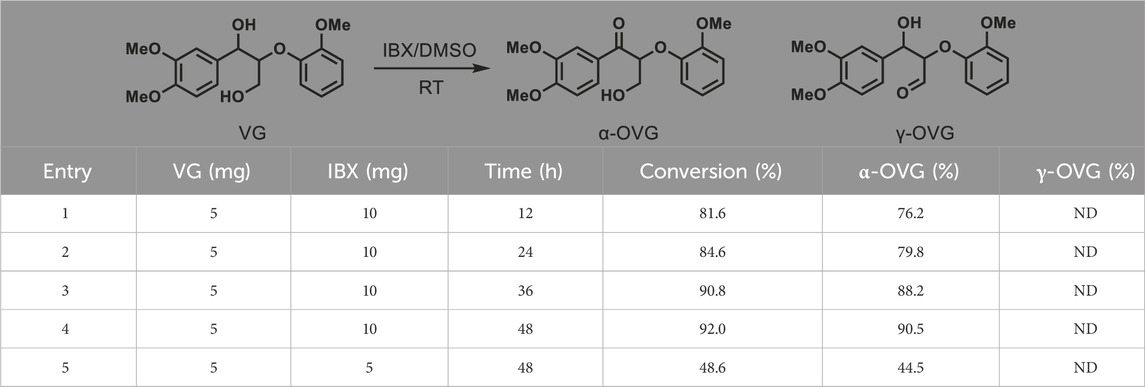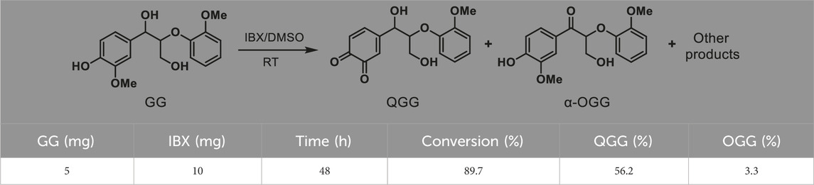 To investigate the oxidation process of VG by IBX, 5 mg of substrate and 10 mg of IBX (∼2.3 equiv.) were mixed for reaction (Table 1, entry 1–4). As the reaction time was extended from 12 to 48 h, the conversion of VG increased from 81.6% to 92%, and the yield of α-OVG rose from 76.2% to 90.5%. However, when the amount of IBX was reduced to 5 mg (∼1.1 equiv.), both the VG conversion and the α-OVG yield remained low, even after a prolonged reaction time of 48 h (entry 5 in Table 1). These results suggest that the addition of approximately two equivalents of IBX is optimal for the efficient oxidation of VG. Furthermore, phenolic β–O–4 model compound (guaiacylglycerol-β-guaiacyl ether; GG) was employed as a substrate for oxidation. As shown in Table 2, only 3.3% yield of α-OGG was obtained. The major product observed was QGG. This result is attributed to the presence of a phenolic hydroxyl group and an ortho-methoxy group in GG. IBX preferentially oxidized the phenolic hydroxyl group and mediated the oxidative demethylation of the ortho-methoxy methyl group (-CH3). These results suggest that this oxidation process primarily targets the α-OH group within non-phenolic β-O-4 units.