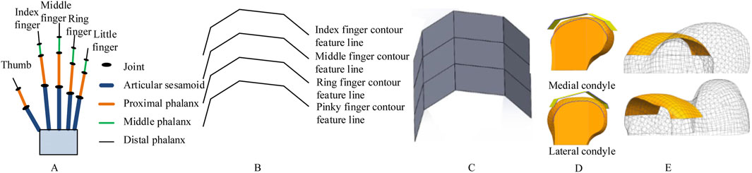 Figure 1. Schematic of bionic hand-inspired structure generation. (A) Human hand structure, encompassing the thumb, index finger, middle finger, ring finger, and little finger. Each finger consists of the articular sesamoid, proximal phalanx, middle phalanx, and distal phalanx. (B) Bionic finger contour feature lines, including the index finger, middle finger, ring finger, and little finger contour feature lines. (C) Bionic fitting surface, constructed based on the finger contour feature lines in Figure 1B and subsequent filling. (D) Projection of the bionic fitting surface onto the medial condyle of the femur. (E) Attachment surface.