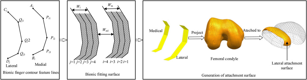 Building upon our research group’s prior work in bone morphological feature extraction (Wang et al., 2021; Wang et al., 2016)and implant construction (Wang et al., 2022), as well as the development of a semantic feature parameter system for bone plate design (Wang et al., 2017), we propose a novel method for designing femoral condylar prosthesis attachment surfaces inspired by bionic hand-inspired structure. Our methodology comprises three pivotal steps: (1) Constructing bionic finger contour feature lines using anatomical key points (Figure 1B), (2) Generating adjustable bionic fitting surfaces (Figure 1C), and (3) Creating attachment surfaces through projection (Figures 1D,E). The bionic fitting surface can be efficiently tailored through bending and size parameters, achieving a balance between simplicity and clinical adaptability.