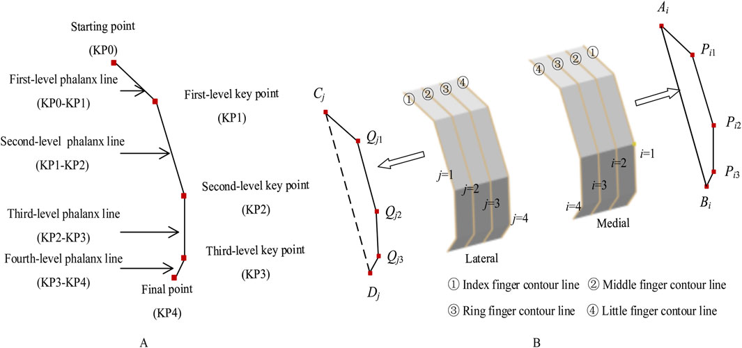 Figure 3. Bionic finger contour feature lines. (A) Composition of a bionic finger contour feature line, constructed from key points including the starting point, first-level key point, second-level key point, third-level key point, and final point. These key points generate first-level, second-level, third-level, and fourth-level phalanx lines. (B) Medial and lateral bionic finger contour feature lines, consisting of index, middle, ring, and little finger contour feature lines. The medial lines are sequentially numbered 1 to 4 from inside to outside (Ai, Pi1, Pi2, Pi3, Bi), while the lateral lines are numbered 1 to 4 from outside to inside (Cj, Qj1, Qj2, Qj3, Dj).