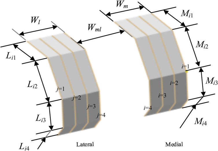 As shown in Figure 5, the width parameters of the bionic fitting surface include the following: the medial bionic fitting surface width (Wm), equivalent to the projection distance of