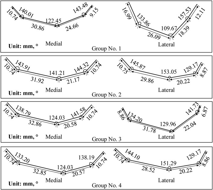 Similarly, for the lateral bionic hand-inspired structure, the finger contour lines, from outside to inside, are the index finger contour (j = 1), middle finger contour (j = 2), ring finger contour (j = 3), and little finger contour (j = 4). The key points for constructing each finger contour of the lateral bionic hand-inspired structure are the starting point Cj, first-level key point Qj1, second-level key point Qj2, third-level key point Qj3, and final point Dj. Qj1 is positioned at the same height as Lhigh, the highest point of the lateral femoral condyle, and extends along the positive direction of the coronal axis. The distance between Qj1 and Llateral is denoted as Hjl1. Qj2 is situated at the same height as Lmedial, the highest point of the lateral femoral condyle, and extends along the positive direction of the coronal axis, with the distance between Qj2 and Lmedial denoted as Hjl2. Qj3 is located at the same height as Llow, the most lateral point of the lateral femoral condyle, and extends along the positive direction of the coronal axis, with the distance between Qj3 and Lmedial recorded as Hjl3. The distances Hjl1, Hjl2, and Hjl3 are calculated using Equation 2.