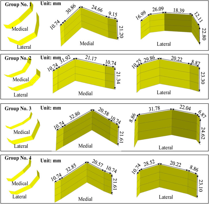 Figure 7. Femoral condylar bionic fitting surfaces. Comprising both medial and lateral surfaces, these fitting surfaces were constructed based on the finger contour feature lines illustrated in Figure 6. Each experimental group corresponds to a distinct parameter set outlined in Table 1 and visualized in Figure 6.