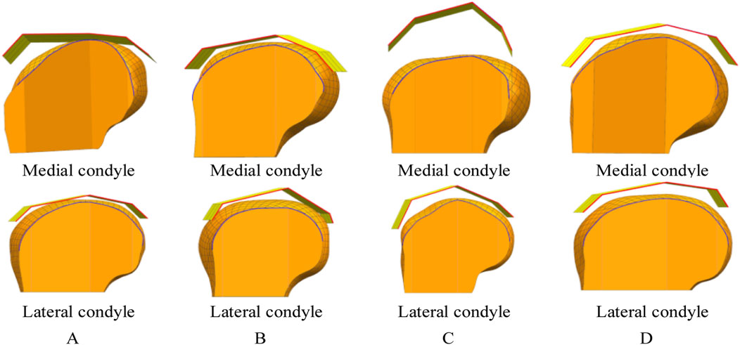 Figure 8. Projection lines generated by projecting the contour feature line (from Figure 7) onto the femoral condyle. The bionic palm attachment surface is projected onto the medial condyle of the femur. The red line represents the index finger contour feature line of the bionic palm attachment surface, while the blue line denotes the corresponding projection line on the femoral condyle. (A) Group No. 1. (B) Group No. 2. (C) Group No. 3. (D) Group No. 4.