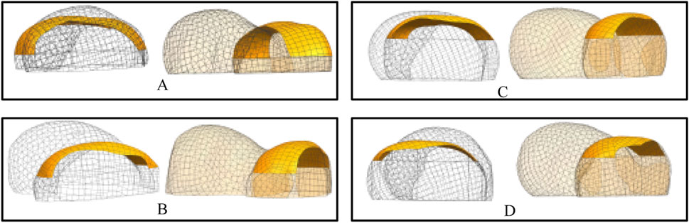 Figure 9. Lateral attachment surfaces. Each set of results provides a rendering of two viewpoints. (A) Attachment surfaces corresponding to the parameter sets in Table 1 (Group 1). (B) Attachment surfaces corresponding to the parameter sets in Table 1 (Group 2). (C) Attachment surfaces corresponding to the parameter sets in Table 1 (Group 3). (D) Attachment surfaces corresponding to the parameter sets in Table 1 (Group 4).