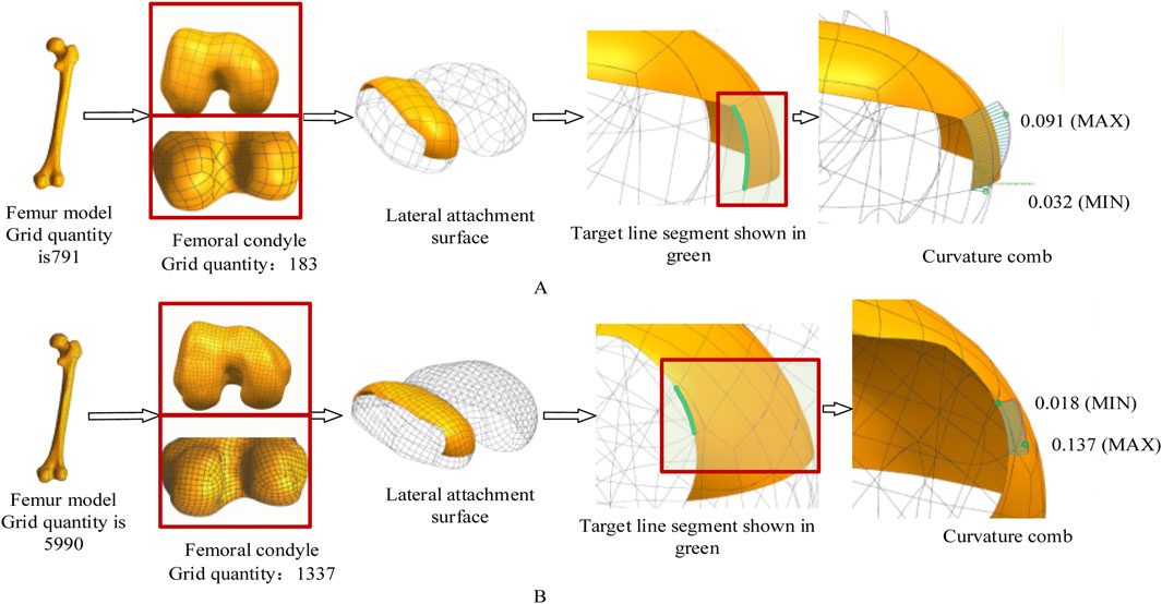 Figure 10. The effect of different mesh accuracies on the experimental results. In this experiment, the femoral mesh model is represented by a quadrangle mesh. The curvature comb is used to display the curvature direction change and magnitude of the contour feature line. The change of the curvature comb line in Figure 10B is more uniform, indicating better curve fairness. Maximum curvature decreased from 0.091 mm-1 (A) to 0.018 mm-1 (B). (A) Coarse mesh (8 mm element size). (B) Fine mesh (3 mm element size).