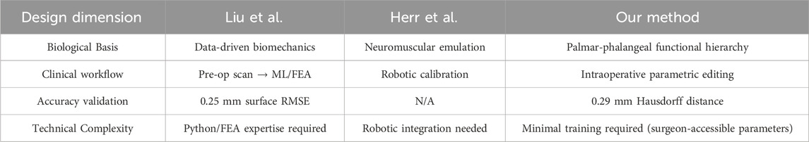 The core innovation of this work lies in its functional biomimicry. Unlike approaches that directly copy anatomical shapes, our method abstracts the hierarchical curvature control observed in the palmar-phalangeal system (Bai et al., 2024) into a parametric design system. This allows for dynamic adaptation to the femoral condyle’s surface, addressing the static geometric mismatch common in traditional CAD. Our bionic curvature-adaptation approach provides a new paradigm in orthopedic implant design by synergizing anatomical fidelity with clinical efficiency, as evidenced by these critical differentiators from leading methodologies shown in Table 2.