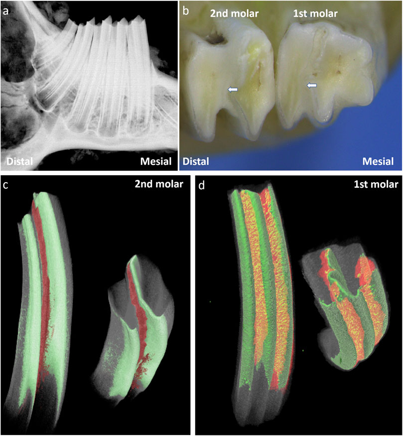 Figure 1. A schematic images of the structure of rabbit molars for 50 days. Note: (a) Radiograph of the rabbit mandibular molars; (b) Occlusal view of the mandibular first molar and second M, the white arrows indicate the enamel folding areas formed by enamel invagination in the rabbit’s molar.; (c) 3D Reconstructed Image of the Second Mandibular Molar of Rabbit after 3D Segmentation (Masking) of CT Data; (d) 3D Reconstructed Image of the First Mandibular Molar of Rabbit after 3D Segmentation (Masking) of CT Data; . The green area indicates enamel, The red area represents the cellular cementum that has invaginated into the enamel folding area.