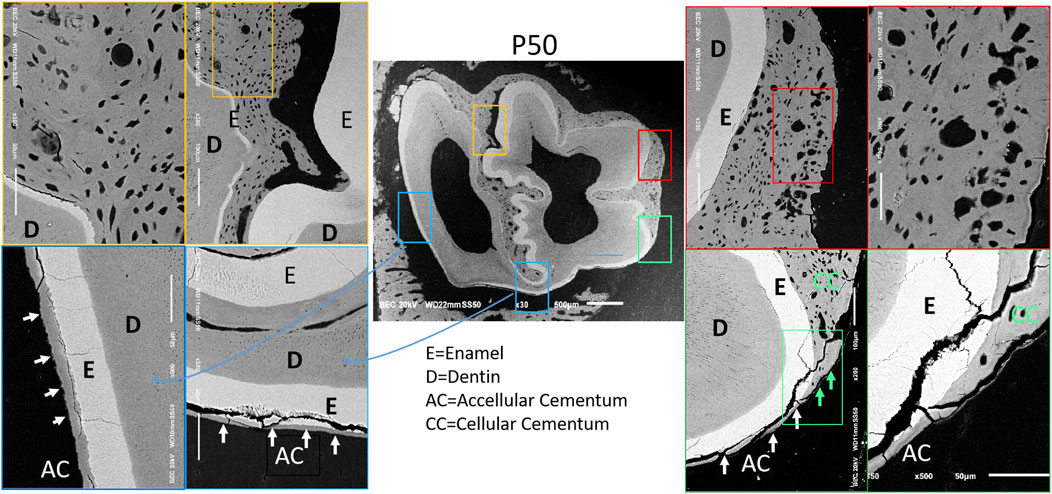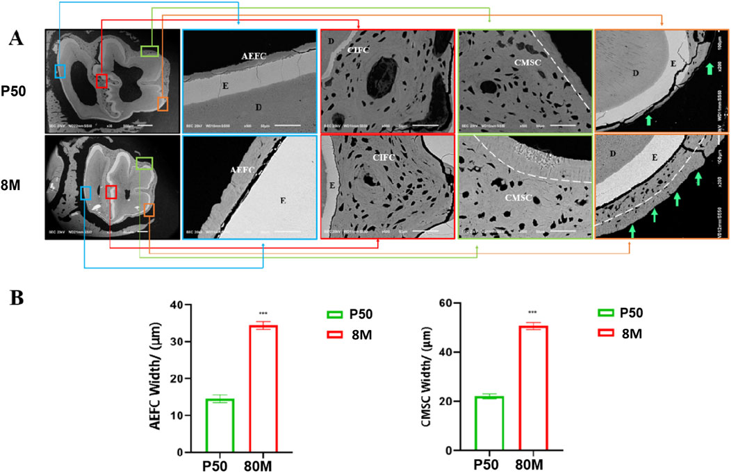 Based on the CT data, we selected the mandibular first molars of rabbits at P50 and 8 months of age, where the most significant changes were observed, for cross-sectional scanning electron microscopic analysis. Within the full cross-sectional images, four regions were chosen from left to right for magnified observation and were labeled with distinct colors—specifically blue, red, green, and orange in left-to-right order. These labeled regions are presented sequentially on the right side of the cross-sectional images. It was observed that the morphology and structure of cementum in rabbit molars varied across different regions. Herein, the cementum of rabbit molars was labeled in accordance with the classification system proposed by Yamamoto (Yamamoto et al., 2016) (Figure 4A). (1) The blue region corresponds to the acellular cementum located on the outer side of the enamel on the distal surface of the distal cusp of the rabbit mandibular first molar. This portion of cementum is devoid of cells and is connected to the periodontal ligament; thus, we consider it to be part of the acellular extrinsic fiber cementum (AEFC). Moreover, with increasing age, the width of AEFC increases significantly (Figure 4B); (2) The red region corresponds to the cellular intrinsic fiber cementum (CIFC) located between the enamel of the mesial and distal cusps of the rabbit molar. Since it is sandwiched between the enamel on both the left and right sides and does not come into contact with the periodontal ligament at all, we consider that no exogenous periodontal ligament fibers will penetrate into it; (3) The green region corresponds to the cellular cementum located at the enamel fold of the mesial buccal cusp. Its outermost layer is connected to the periodontal ligament. As observed, it contains abundant cells and has exogenous periodontal ligament fibers penetrating into it; thus, we consider it to be part of the cellular mixed stratified cementum (CMSC). And obviously, the surface of CMSC exhibits a lamellar acellular cementum structure. Furthermore, with increasing age, this lamellar structure thickens significantly (p < 0.001) (Figure 4B). (4) The orange region is located at the angle where the mesial surface and lingual surface of the mesial cusp meet. The cementum on the lingual surface was distinctly acellular at 50 days, but transformed into mixed cementum by 8 months of age. Moreover, the outermost layer, which connects to the periodontal ligament, still exhibits a lamellar structure.