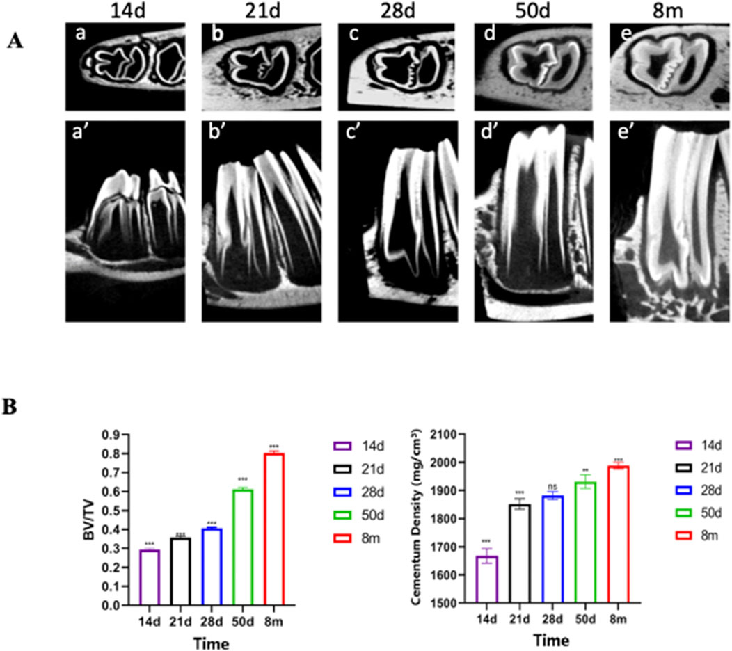 Figure 3. Micro-CT Reveals Significant Thickening and Density Increase in Rabbit Cementum. (A) CT scan images of rabbit teeth and Bone volume fraction Note: a–e represent transverse sections; a′–e′ represent sagittal sections. (B) Data are presented as mean ± standard deviation (n = 5). One - way ANOVA was performed to assess overall group differences, followed by Tukey’s HSD post - hoc tests for pairwise comparisons. Note: a:vs. P14 P < 0.001; b:vs. P28 P < 0.01; c:vs. P28 P < 0.001; d:vs. P50 P < 0.05.