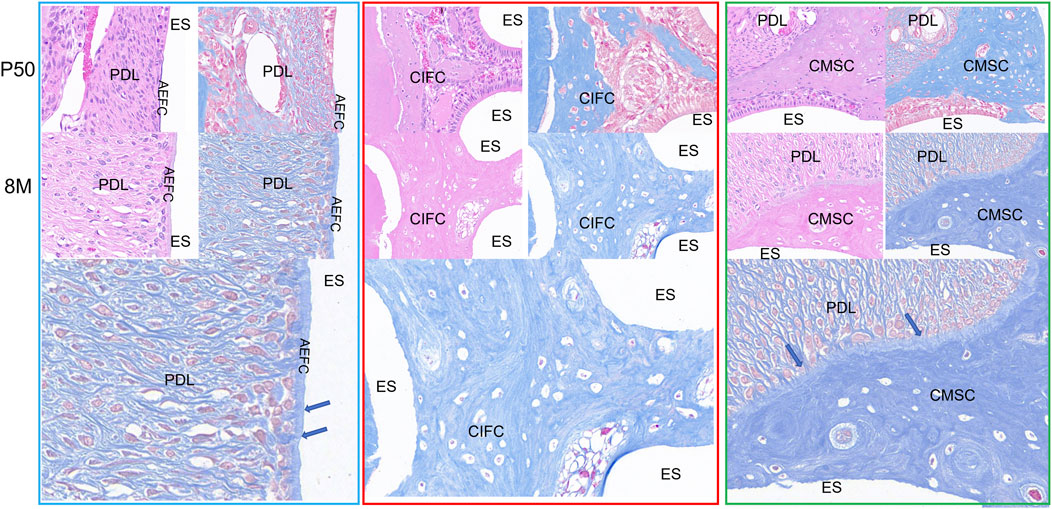 Figure 5. Cementum distribution images of mandibular first molar in rabbits at 50 days and 8 months. Note: AM: Ameloblasts; AEFC: Acellular extrinsic fiber cementum; AB: Alveolar bone; CIFC: Cellular intrinsic fiber cementum; CMSC: Cellular mixed stratified cementum; D: Dentin; ES: Enamel space; PDL: Periodontal ligament; The blue arrows represent Sharpey’s fibers.