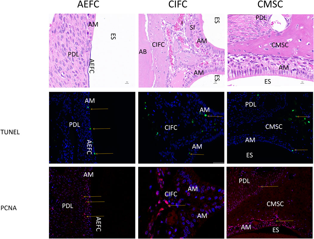 Figure 6. Expression images of PCNA and TUNEL in 50-day rabbit mandibular first molars Note: Yellow arrows indicate positive expression in both epithelial and mesenchymal cells. AM: Ameloblasts; AEFC: Acellular extrinsic fiber cementum; AB: Alveolar bone; CIFC: Cellular intrinsic fiber cementum; CMSC: Cellular mixed stratified cementum; D: Dentin; ES: Enamel space; PDL: Periodontal ligament; scale bar = 20 μm.