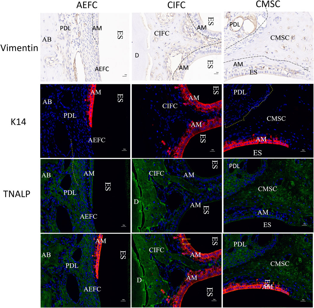 Figure 7. Vinmentin, K14, TNALP, K14-TNALP staining Note: AM: Ameloblasts; AEFC: Acellular extrinsic fiber cementum; AB: Alveolar bone; CIFC: Cellular intrinsic fiber cementum; CMSC: Cellular mixed stratified cementum; D: Dentin; ES: Enamel space; PDL: Periodontal ligament; scale bar = 20 μm.