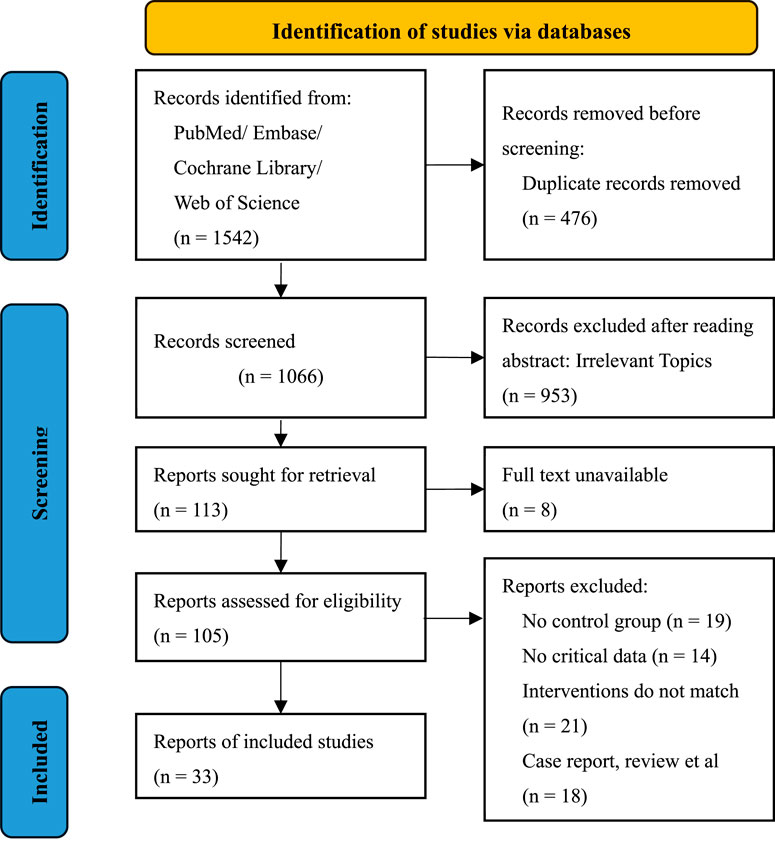 A total of 1,542 records were retrieved from PubMed, Embase, Cochrane Library, and Web of Science. After removing 476 duplicates, 1,066 records were screened by title and abstract. Of these, 953 were excluded for irrelevance. Among the 113 full-text articles assessed for eligibility, 8 were unavailable. Of the remaining 105 studies, 72 were excluded due to lack of a control group, missing outcome data, unmatched interventions, or non-RCT design. Ultimately, 33 RCTs were included in the final analysis. The detailed selection process is illustrated in the PRISMA flow diagram (Figure 1).