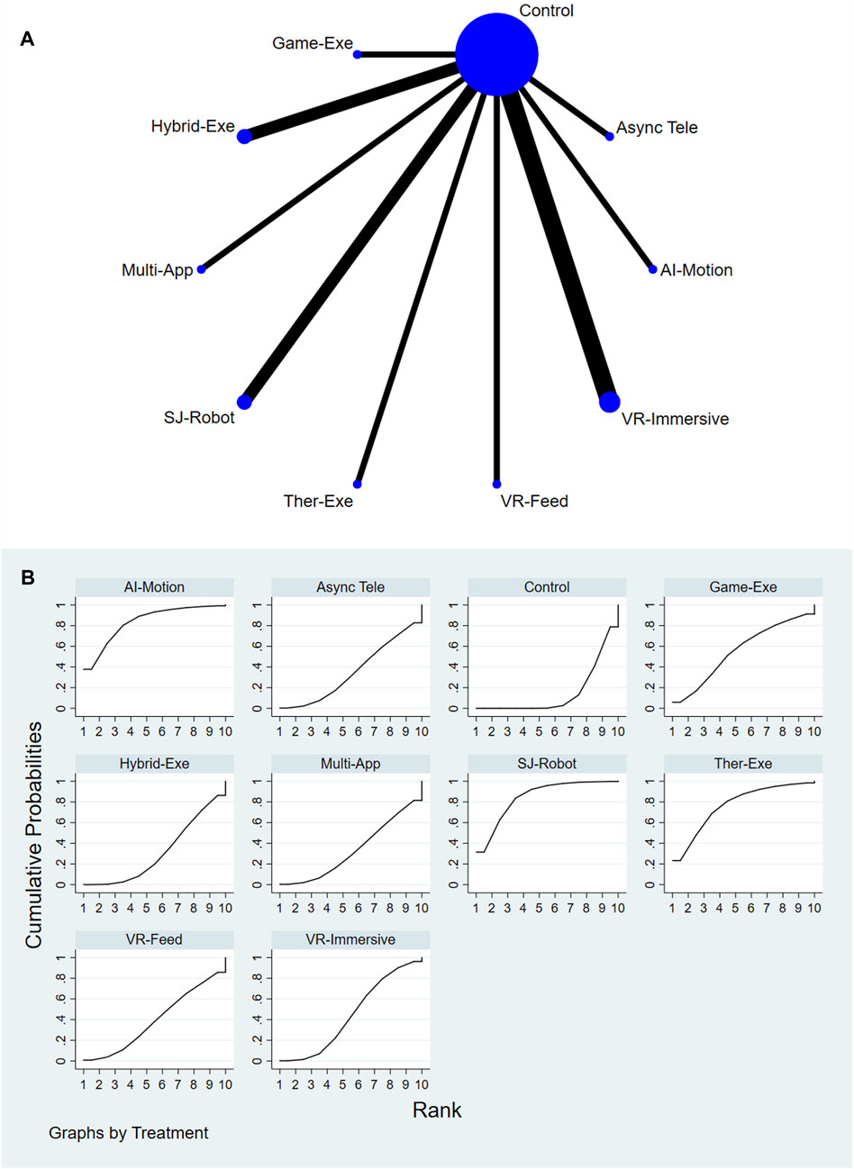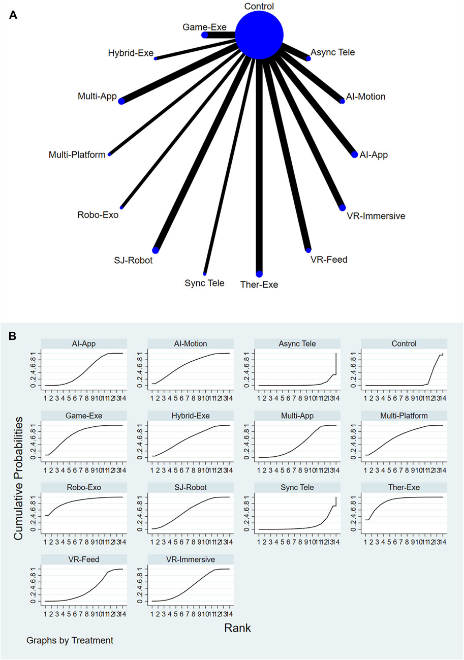 In contrast, Gamified Exergaming (SUCRA = 31.2%) and Conventional or Usual Care (SUCRA = 15.0%) performed less effectively in improving ROM. While Gamified Exergaming has proven benefits in improving functional outcomes, it may not provide the specific, targeted interventions needed to address joint stiffness. As a more generalized exercise intervention, it may not be able to provide the level of specificity required for patients with significant ROM limitations. Conventional or Usual Care, which typically lacks the personalization and intensity of AI-assisted interventions, showed the lowest rankings, reinforcing the idea that more tailored, technology-driven approaches are superior for improving ROM (Cullen et al., 2012; Proffitt and Lange, 2015).