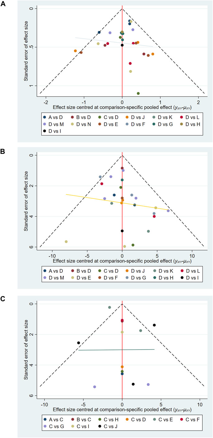 Comparison-adjusted funnel plots were used to evaluate potential publication bias (Albanese et al., 2021). As shown in Figures 5A–C, the funnel plots for pain, functional outcomes, and ROM appeared generally symmetric, indicating a low risk of selective reporting or small-study effects.
