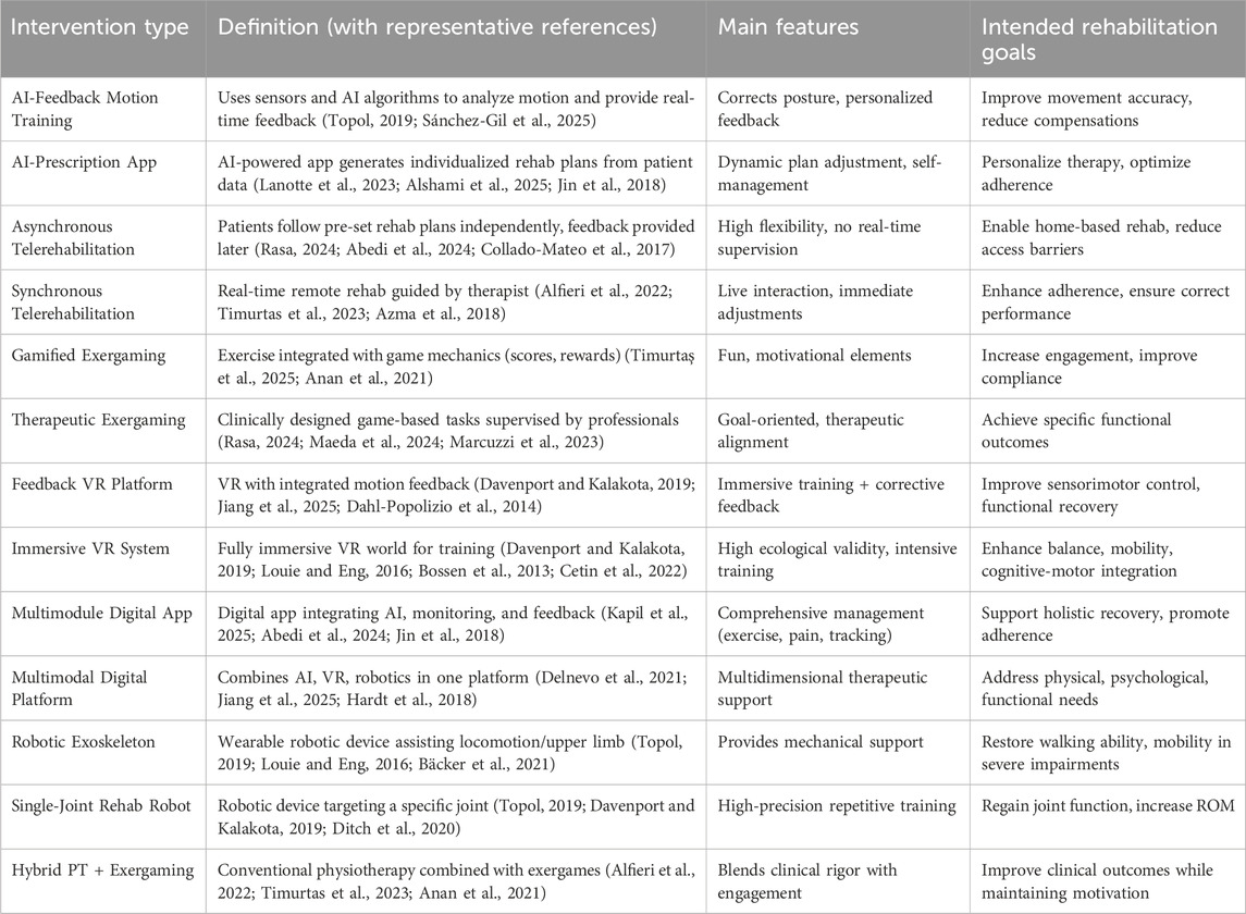 AI-assisted rehabilitation encompasses a wide range of approaches with different technological foundations, delivery formats, and therapeutic objectives. To ensure systematic comparison and consistency with our subsequent network meta-analysis (NMA), all included interventions were categorized into 13 distinct types, spanning AI-based systems, robotics, virtual reality (VR), telerehabilitation, exergaming, and multimodal platforms (The detailed classification is summarized in Table 1).