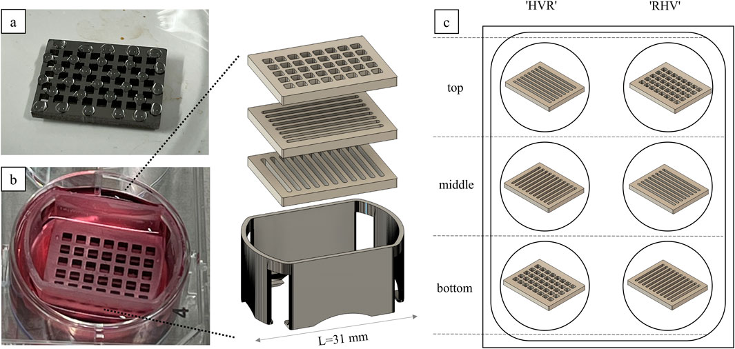 Nevertheless, using the MTT assay, it can be shown that the cells grew equally well on the different stacked models. Normalization of the MTT results to the surface area was not necessary as the surface area available for cell attachment on all platelets is approximately 1,500 mm2. Furthermore, it is suggested that no substantial differences are visible since the pore channel of the stacked platelets is always similar, resulting in comparable migration paths for the cells. The stacking sequence of the platelets remains the same, but the layer of colonization varies. This layer is important since the pattern may affect the adhesion of the cell suspension to the surface, resulting in variations in the cell count on the platelet. Rectangular platelets have wider bars than vertical and horizontal structures, leading to greater adhesion of the cell suspension to the platelet. Other studies have reported the problem that the cell suspension is running through the pores of the plates during the initial cell seeding (Noskovicova et al., 2021). This may be the source for minor deviations between the models. By applying the cells dropwise on the top platelet, this issue should be prevented in order to create the same starting conditions for all models. The developed holder functioned as a tool to maintain the alignment of the platelets, thereby preventing them from floating away and avoiding direct contact between the platelets and the bottom of the well. The resulting movement of the medium below the model prevented air bubbles from forming inside, which would have negatively affected the oxygen gradient and nutrient supply. Commercial cell culture platforms are available, such as CellCrowns™ (Scaffdex) or Transwell® inserts (Corning), providing a solution to allow medium supply from both the apical and basal sides of cell layers or round scaffolds. However, for rectangular or non-standard scaffold geometries, commercial solutions are limited, making the development of custom-made holders necessary to ensure defined positioning, reproducible experimental conditions, and compatibility with existing laboratory vessels.
