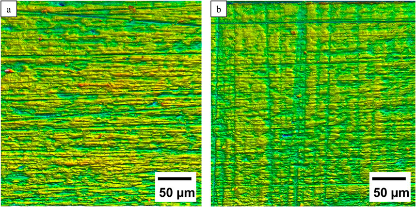 The p-values (p > 0.05) demonstrate that there is no significant difference between the roughness values of both surface conditions: p_Sa = 0.8, p_Sz = 0.25, p_Sv = 0.93, p_Ra = 0.67, p_Rz = 0.42, p_Rv = 0.42. However, manual polishing results in a smoother surface, as visualized in the confocal microscope in Figure 2.