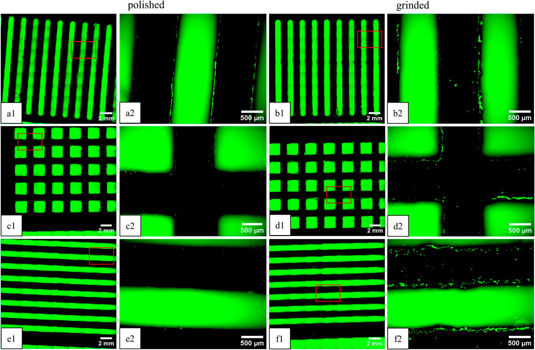 Figure 3. Fluorescence microscopy images of green-labeled fibroblasts on Ti-6Al-4V platelets on day 14 (view of the underside). The plates were stacked in “vertical” on top (a1, a2, b1, b2) “rectangular” (c1, c2, d1, d2) in the middle, and “horizontal” (e1, e2, f1, f2) alignment on the bottom. Comparison of polished (left) and ground plates (right). The images on the right (“x1”) correspond to an enlarged section (4x) of the overview image on the left (“x2”).