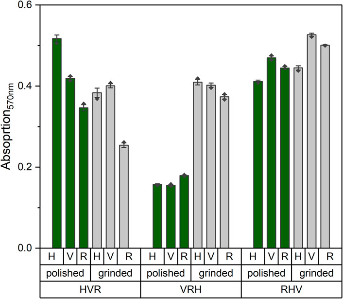 Figure 4. Absorption values of MTT measurements at 570 nm wavelength on day 14 of the stacked models in polished (green) and ground (gray) state. A higher absorption value corresponds to a higher cellular activity.