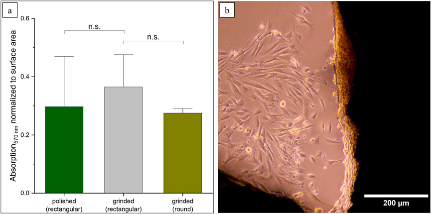 Figure 5. Prospects for more biomimetic structures using round scaffolds. (a) MTT results were normalized according to the surface area (n.s. not significant: ppolished = 0.60, pgrinded = 0.06). (b) Formation of cellular sheets in the edges of the structures.