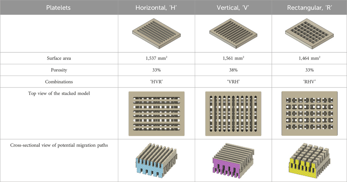 Table 1. Visualization of Ti alloy sheets with different patterned slots and their properties. The combinations describe the order of the stack from top to bottom. Pore channels and potential migration paths are illustrated through top and cross-sectional view.