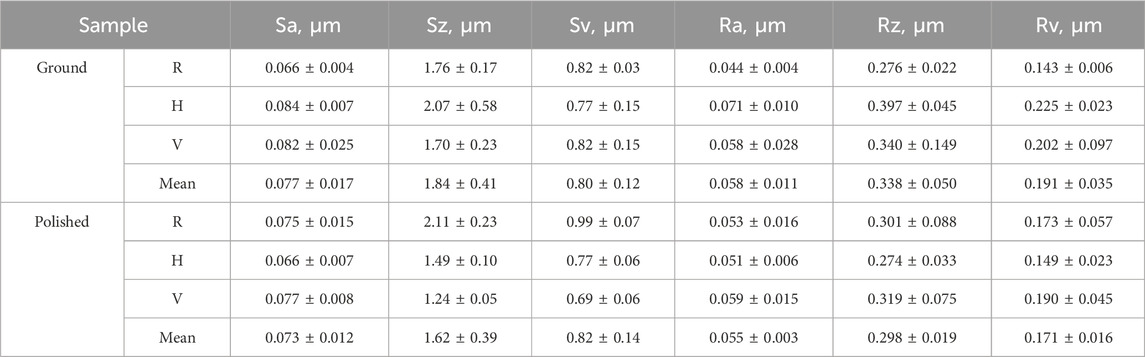Table 2. Surface parameters: arithmetic average height (Sa, Ra), maximum height (Sz, Rz), and maximum recess height (Sv, Rv) of the ground and polished platelets.