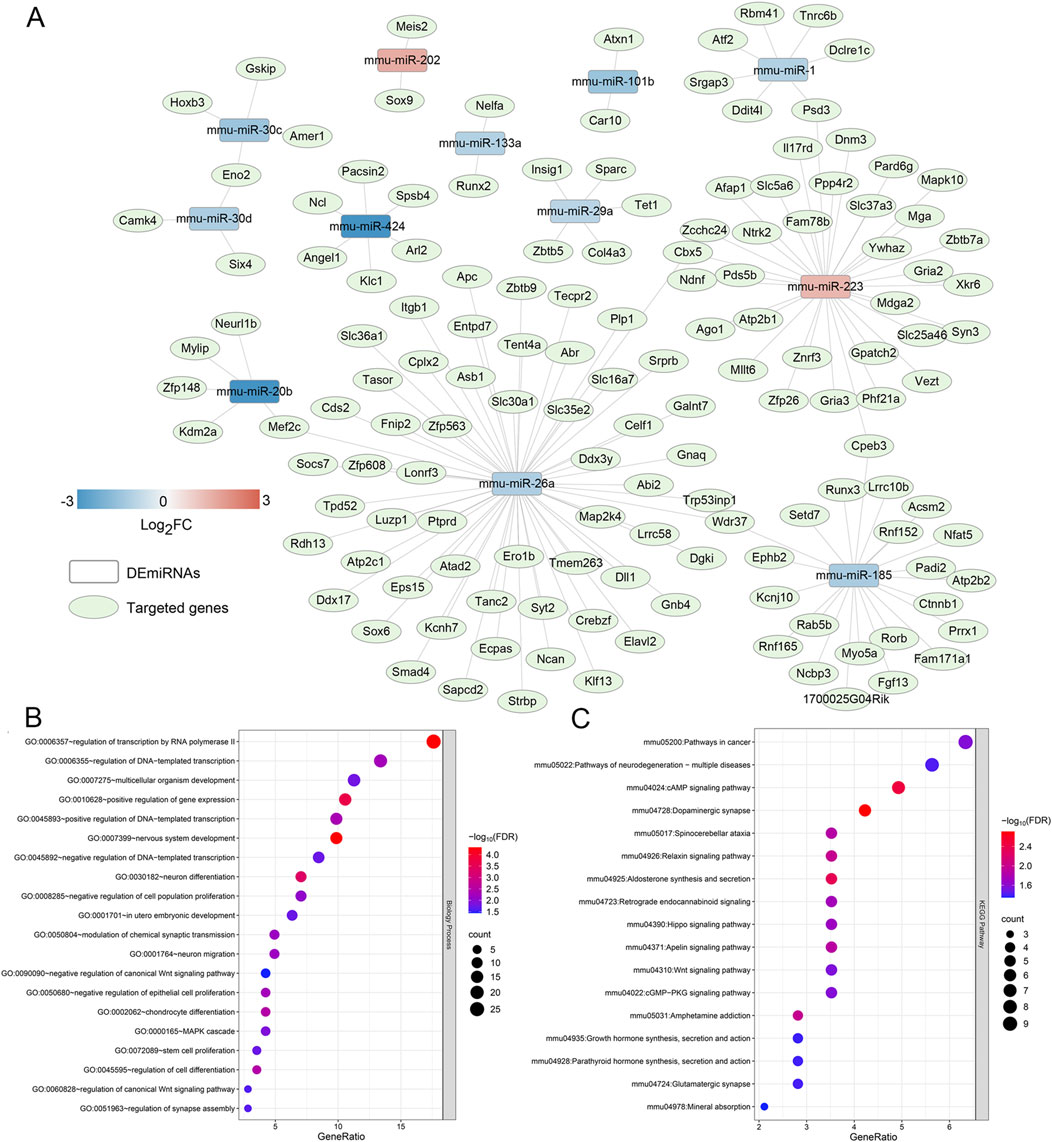 Figure 1. Construction of a miRNA-mRNA regulatory network, and functional analysis of the genes in the network. (A) The miRNA-mRNA regulatory network composed of 12 differentially expressed miRNAs and 143 regulated target genes, and miR-26a, which was down-regulated in the damaged tissues, was the hub node. (B) The significant gene ontology terms of biological process enriched by the genes in the network. (C) The significant Kyoto Encyclopedia of Genes and Genomes pathways enriched by the target genes in the network.