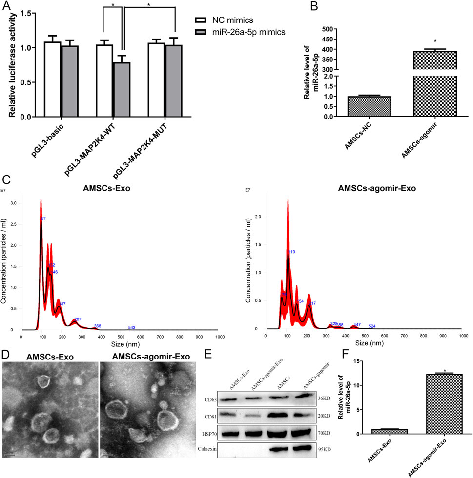 Figure 2. Interaction between miR-26a-5p and MAP2K4, as well as cell transfection efficiency and characterization of the isolated exosomes. (A) MAP2K4 was the target of miR-26a-5p by dual luciferase reporter gene assay. N = 3. *: P < 0.05. (B) The miR-26a-5p level in the AMSCs with miR-26a-5p overexpression to verify the cell transfection efficiency. N = 3. *: P < 0.05, vs. AMSCs-NC. (C) Particle size distribution of AMSCs-derived exosomes and miR-26a-5p overexpressed AMSCs-derived exosomes determined by Nanosight. (D) The morphology of AMSCs-derived exosomes and miR-26a-5p overexpressed AMSCs-derived exosomes, visualized by transmission electron microscopy. (E) The expression of exosomes-specific markers (CD63, CD81, and HSP70) and negative control protein (calnexin) in exosomes and cells, detected by Western blot. (F) The level of miR-26a-5p in the AMSCs-derived exosomes and miR-26a-5p overexpressed AMSCs-derived exosomes. N = 3. *: P < 0.05, vs. AMSCs-Exo.