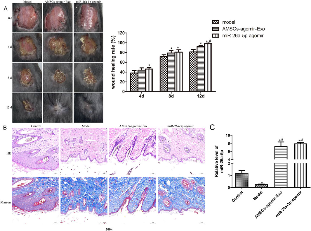 Figure 3. Effects of miR-26a-5p overexpressed AMSCs-derived exosomes on wound healing in mice. (A) The wound healing process in the different groups of mice at days 0, 4, 8, and 12. N = 6. *: P < 0.05, vs. model; #: P < 0.05, vs. AMSCs-agomir-Exo. (B) The morphology of the injured skin in the different groups, observed by Hematoxylin-Eosin (HE) staining and Masson staining. N = 6. (C) The level of miR-26a-5p in the skin tissues of different mice. N = 3. *: P < 0.05, vs. control; #: P < 0.05, vs. model.