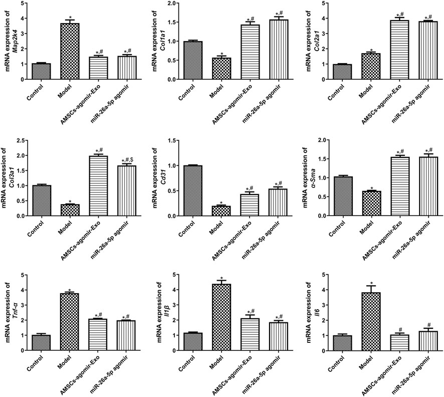 Figure 4. The mRNA expression of related genes, including Map2k4, Col1a1, Col2a1, Col3a1, α-Sma, Tnf-α, Il1β, Il6, and Cd31 in the different groups measured by RT-qPCR. N = 3. *: P < 0.05, vs. control; #: P < 0.05, vs. model; $: vs. AMSCs-agomir-Exo.
