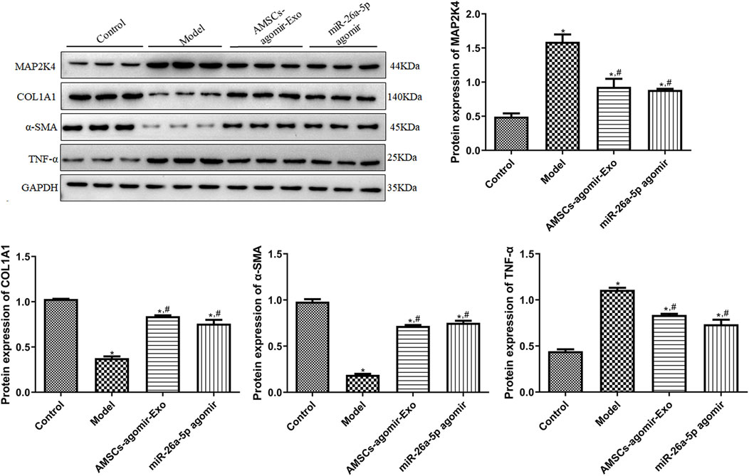 Figure 5. The protein expression of MAP2K4, COL1A1, α-SMA, and TNF-α in the different groups, determined by Western blot. N = 3. *: P < 0.05, vs. control; #: P < 0.05, vs. model; $: vs. AMSCs-agomir-Exo.