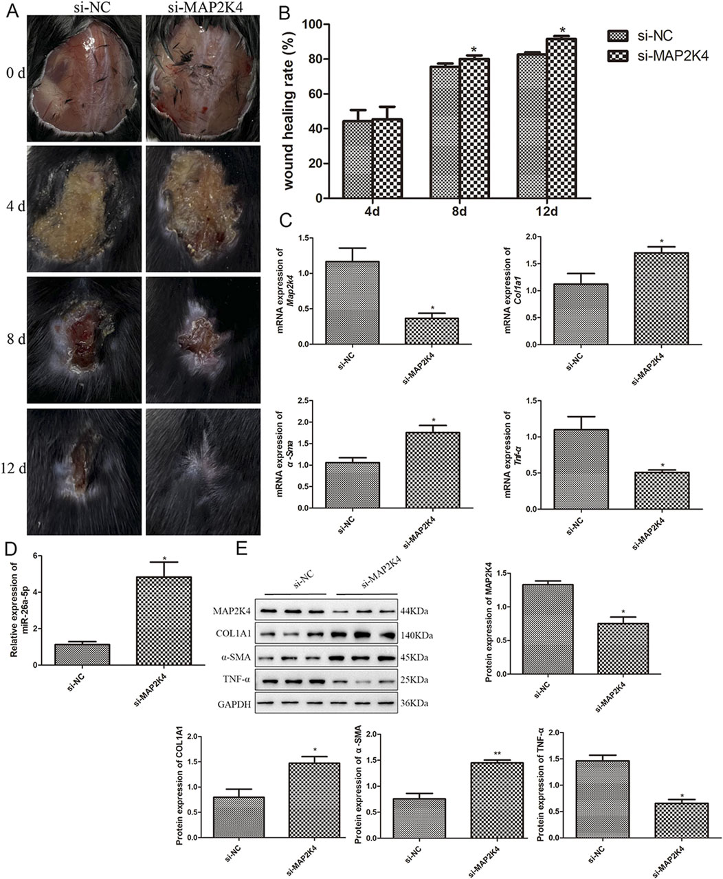 Figure 6. Roles and potential mechanisms of MAP2K4 in wound healing in mice. (A) The wound healing process in the skin defect mice treated with si-NC and si-MAP2K4 at days 0, 4, 8, and 12. N = 6. (B) Quantification analysis of wound healing rate in the skin defect mice treated with si-NC and si-MAP2K4 at days 4, 8, and 12. N = 6. *: P < 0.05, vs. si-NC. (C) The mRNA expression of Map2k4, Col1a1, α-Sma, and Tnf-α in the skin defect mice treated with si-NC and si-MAP2K4, measured by RT-qPCR. N = 3. *: P < 0.05, vs. si-NC. (D) The level of miR-26a-5p in the skin tissues of different mice. N = 3. *: P < 0.05, vs. si-NC. (E) The protein expression of MAP2K4, COL1A1, α-SMA, and TNF-α in the skin defect mice treated with si-NC and si-MAP2K4, detected by Western blot. N = 3. *: P < 0.05, vs. si-NC.